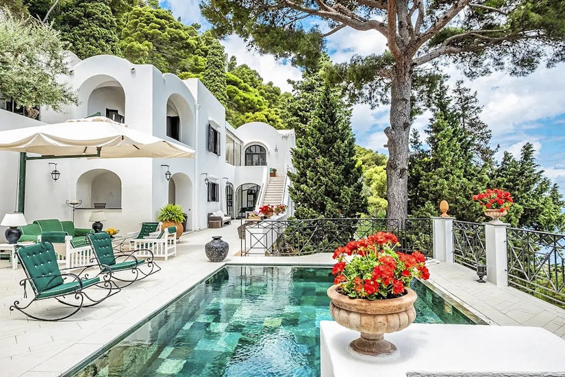 A luxurious limestone villa perched on the cliffs of Capri, offering modern amenities and classic Italian charm.
