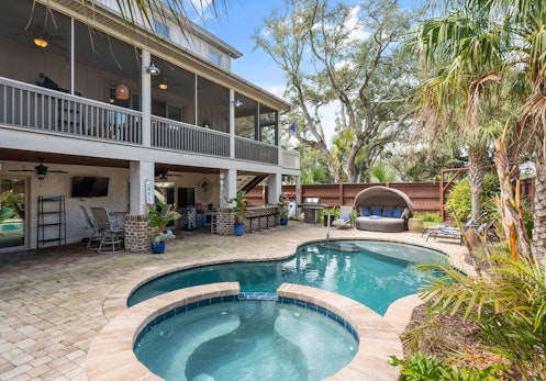 The Heron Cottage is a classically styled St. Simons cottage with a fantastic backyard, a wonderfully private pool and outdoor heated shower and covered bike parking.