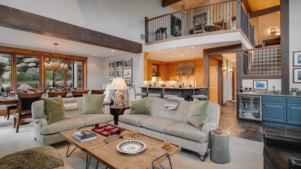 The great room at Black Bear Chalet has vaulted ceilings, a gas fireplace with a stone surround, and an easy flow from the great room to a full wet bar, dining area, and kitchen. Access to a private deck reveals incredible views of the Steamboat ski area and offers a place for outdoor dining or relaxing in warmer months. A lovely back patio is home to a bbq grill, outdoor seating, and a private hot tub for star gazing and relaxation after a long day of adventure.