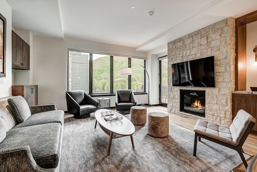 Step into a world of contemporary elegance in this fully renovated Vail residence. Picture yourself unwinding on one of two private decks, both oriented northwest to capture stunning alpine views. Inside, a warm and inviting ambiance welcomes you with a stone-clad gas fireplace and custom designer lighting, setting the stage for unforgettable mountain moments.